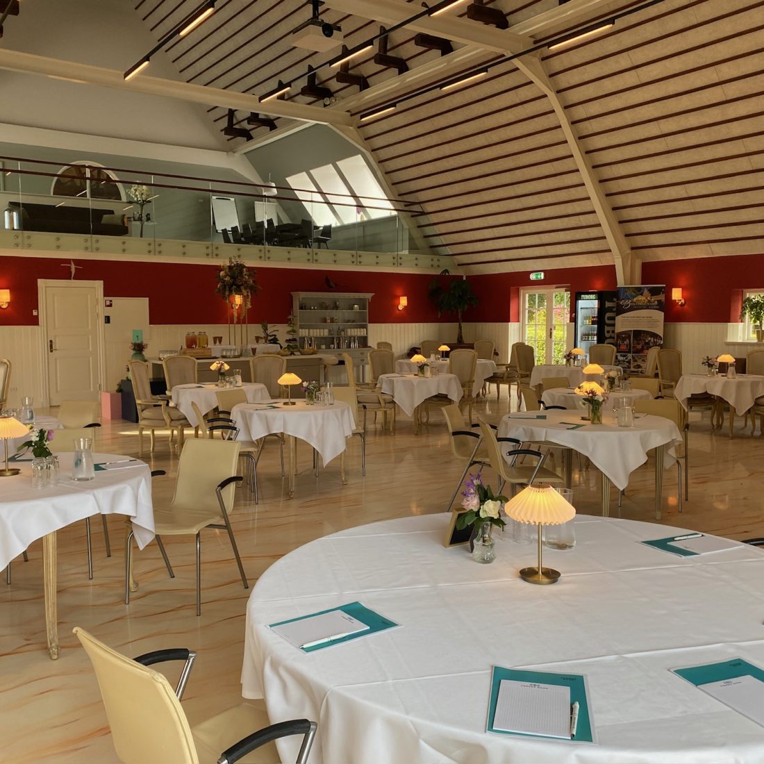 Stort dejligt lokale med fantastisk trækonstruktion, lysekroner og udgang til den store terrasse. Ideelt lokale til både mindre og større møder