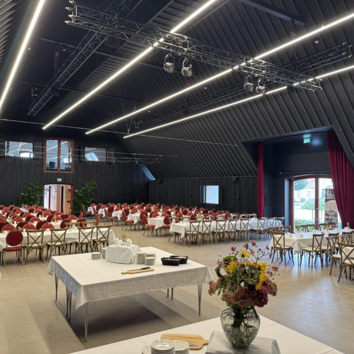 HøstsalenStort lyst lokale med hvide træpaneler og uendeligt højt til loftet. Perfekt lokale til den store konference med op til 200 personer. -